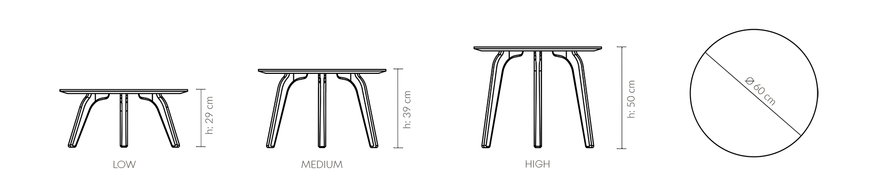 Podstawa i nogi wykonane są z lakierowanego lub olejowanego litego dębu. Wersja czarna dostępna jest w wersji z lakierowanego dębu. Wersja dębowa pokryta jest matowym, bezbarwnym lakierem. Wersja dębowa naturalna, jasna i ciemna wykonana jest z olejowanego litego dębu. Blaty stołów wykonane są z forniru dębowego lub orzechowego z trzema rodzajami wykończenia: olejowanym, lakierowanym i laminowanym.
